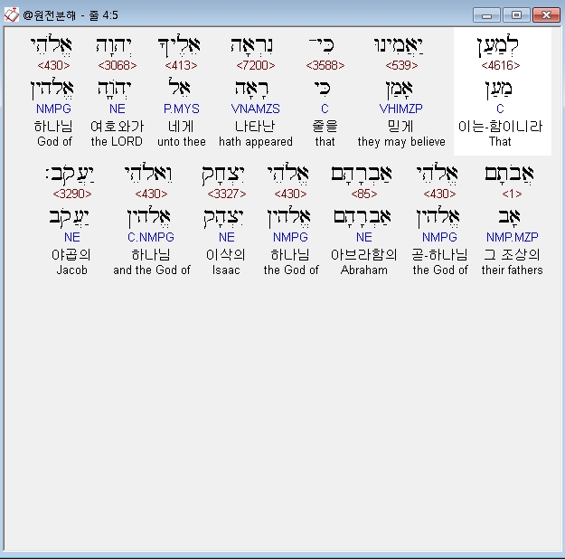 히브리어구약BHS,5 לְמַעַן יַאֲמִינוּ כִּי־נִרְאָה אֵלֶיךָ יְהוָה אֱלֹהֵי אֲבֹתָם אֱלֹהֵי אַבְרָהָם אֱלֹהֵי יִצְחָק וֵאלֹהֵי יַעֲקֹב׃
