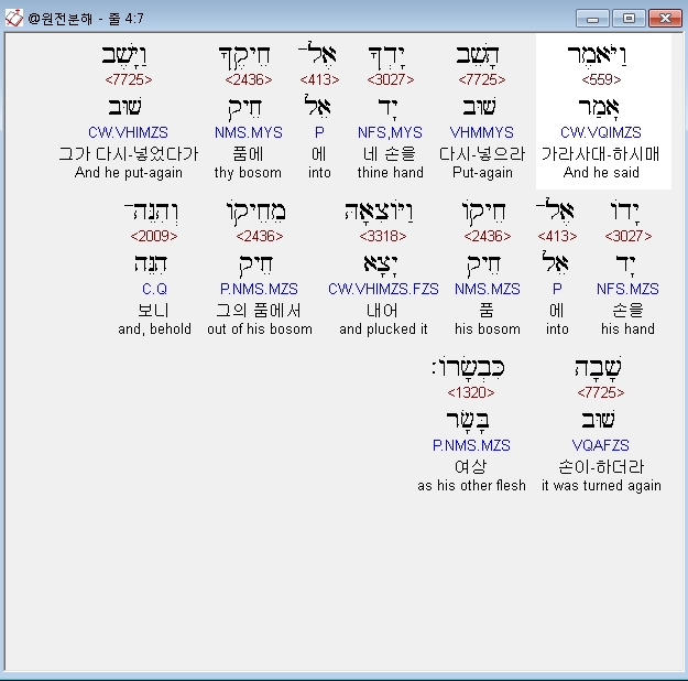 개역개정,7 이르시되 네 손을 다시 품에 넣으라 하시매 그가 다시 손을 품에 넣었다가 내어보니 그의 손이 본래의 살로 되돌아왔더라