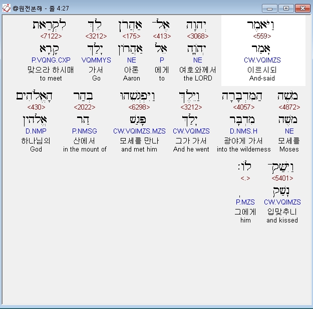 히브리어구약BHS,27 וַיֹּאמֶר יְהוָה אֶל־אַהֲרֹן לֵךְ לִקְרַאת מֹשֶׁה הַמִּדְבָּרָה וַיֵּלֶךְ וַיִּפְגְּשֵׁהוּ בְּהַר הָאֱלֹהִים וַיִּשַּׁק־לֹו׃
