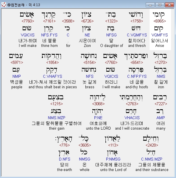 히브리어구약BHS,13 קוּמִי וָדֹושִׁי בַת־צִיֹּון כִּי־קַרְנֵךְ אָשִׂים בַּרְזֶל וּפַרְסֹתַיִךְ אָשִׂים נְחוּשָׁה וַהֲדִקֹּות עַמִּים רַבִּים וְהַחֲרַמְתִּי לַיהוָה בִּצְעָם וְחֵילָם לַאֲדֹון כָּל־הָאָרֶץ׃