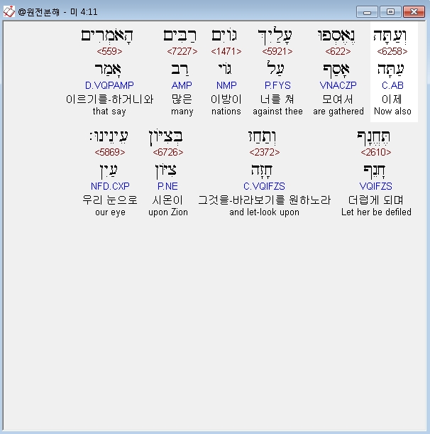 히브리어구약BHS,11 וְעַתָּה נֶאֶסְפוּ עָלַיִךְ גֹּויִם רַבִּים הָאֹמְרִים תֶּחֱנָף וְתַחַז בְּצִיֹּון עֵינֵינוּ׃