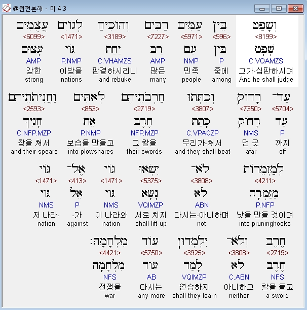 히브리어구약BHS,3 וְשָׁפַט בֵּין עַמִּים רַבִּים וְהֹוכִיחַ לְגֹויִם עֲצֻמִים עַד־רָחֹוק וְכִתְּתוּ חַרְבֹתֵיהֶם לְאִתִּים וַחֲנִיתֹתֵיהֶם לְמַזְמֵרֹות לֹא־יִשְׂאוּ גֹּוי אֶל־גֹּוי חֶרֶב וְלֹא־יִלְמְדוּן עֹוד מִלְחָמָה׃