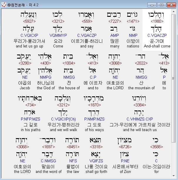 헬라어구약Septuagint,2 και πορευσονται εθνη πολλα και ερουσιν δευτε αναβωμεν εις το ορος κυριου και εις τον οικον του θεου ιακωβ και δειξουσιν ημιν την οδον αυτου και πορευσομεθα εν ταις τριβοις αυτου οτι εκ σιων εξελευσεται νομος και λογος κυριου εξ ιερουσαλημ
