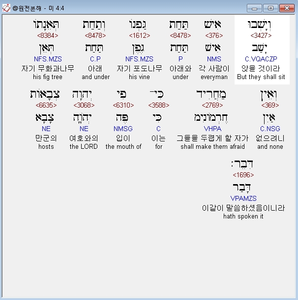 히브리어구약BHS,4 וְיָשְׁבוּ אִישׁ תַּחַת גַּפְנֹו וְתַחַת תְּאֵנָתֹו וְאֵין מַחֲרִיד כִּי־פִי יְהוָה צְבָאֹות דִּבֵּר׃