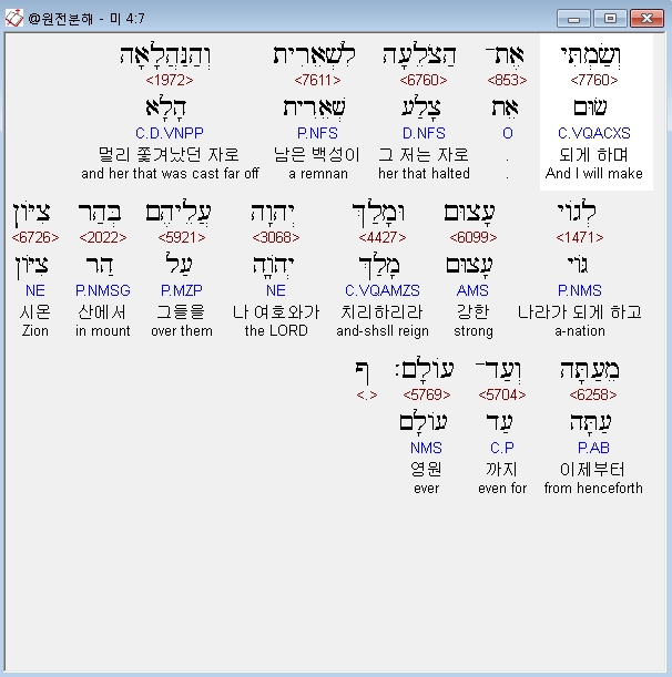 히브리어구약BHS,7 וְשַׂמְתִּי אֶת־הַצֹּלֵעָה לִשְׁאֵרִית וְהַנַּהֲלָאָה לְגֹוי עָצוּם וּמָלַךְ יְהוָה עֲלֵיהֶם בְּהַר צִיֹּון מֵעַתָּה וְעַד־עֹולָם׃ ף