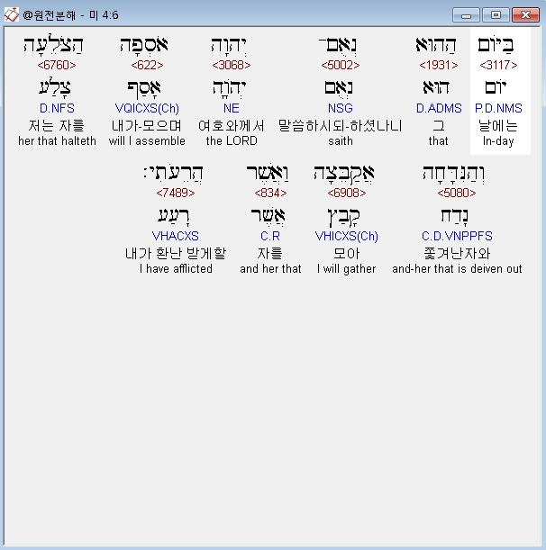 히브리어구약BHS,6 בַּיֹּום הַהוּא נְאֻם־יְהוָה אֹסְפָה הַצֹּלֵעָה וְהַנִּדָּחָה אֲקַבֵּצָה וַאֲשֶׁר הֲרֵעֹתִי׃