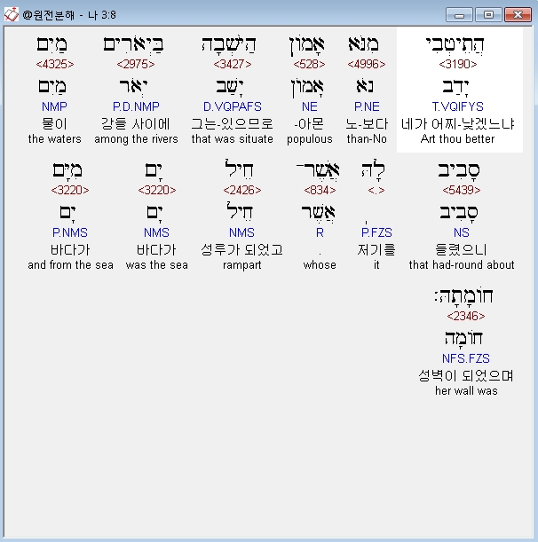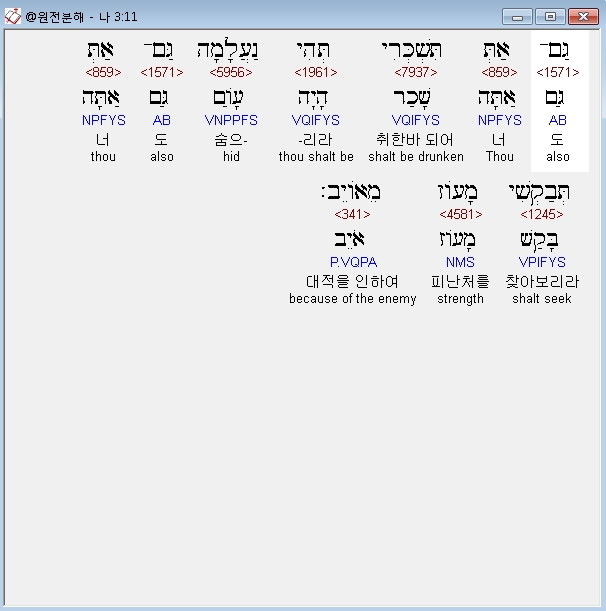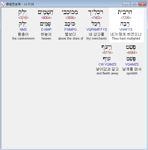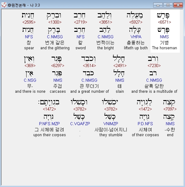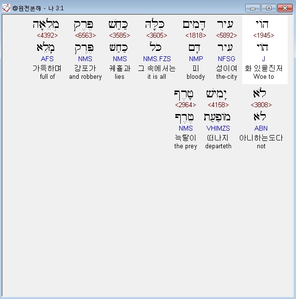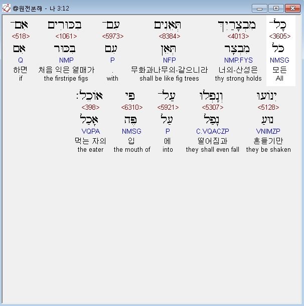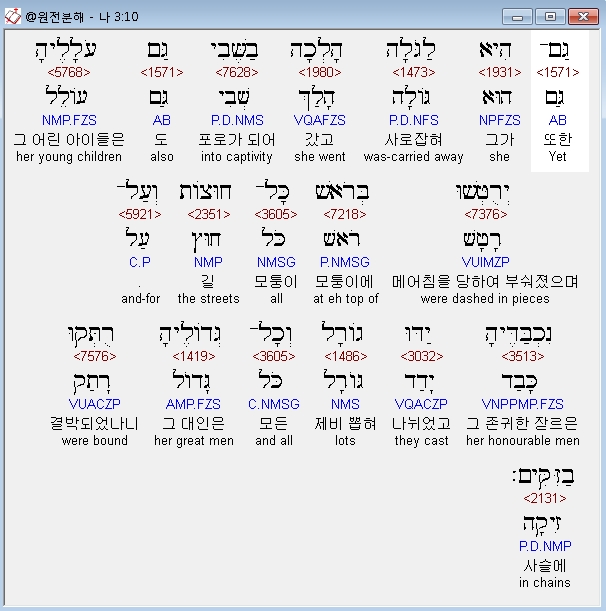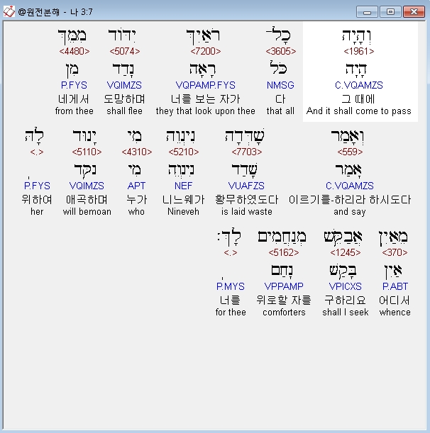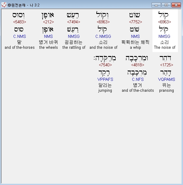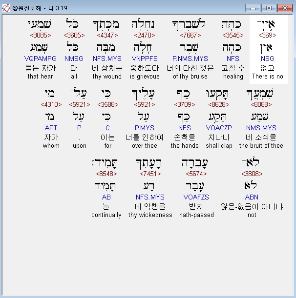 | 히브리어 나훔 2장 전체 원어 원문 성경 공부 주석 강해 설교 해설 해석 (0) | 2020.10.27 |