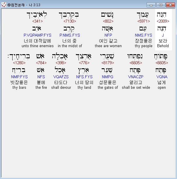 히브리어구약BHS,13 הִנֵּה עַמֵּךְ נָשִׁים בְּקִרְבֵּךְ לְאֹיְבַיִךְ פָּתֹוחַ נִפְתְּחוּ שַׁעֲרֵי אַרְצֵךְ אָכְלָה אֵשׁ בְּרִיחָיִך׃