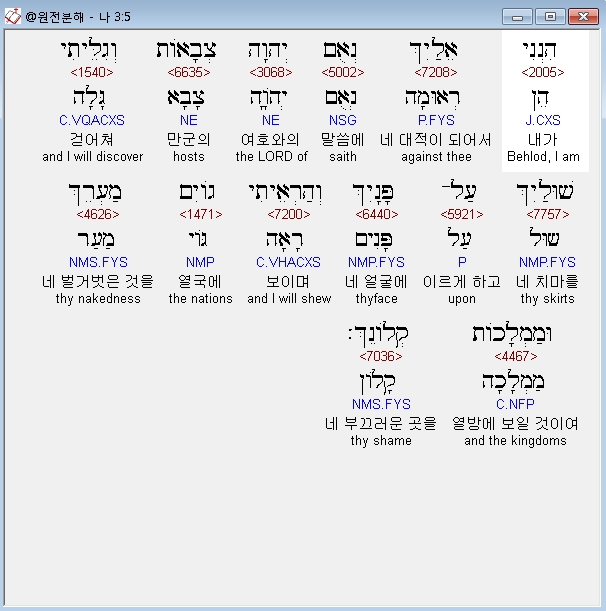 히브리어구약BHS,5 הִנְנִי אֵלַיִךְ נְאֻם יְהוָה צְבָאֹות וְגִלֵּיתִי שׁוּלַיִךְ עַל־פָּנָיִךְ וְהַרְאֵיתִי גֹויִם מַעְרֵךְ וּמַמְלָכֹות קְלֹונֵךְ׃