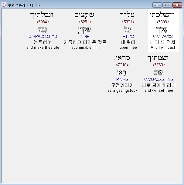 히브리어구약BHS,6 וְהִשְׁלַכְתִּי עָלַיִךְ שִׁקֻּצִים וְנִבַּלְתִּיךְ וְשַׂמְתִּיךְ כְּרֹאִי׃