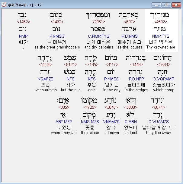 히브리어구약BHS,17 מִנְּזָרַיִךְ כָּאַרְבֶּה וְטַפְסְרַיִךְ כְּגֹוב גֹּבָי הַחֹונִים בַּגְּדֵרֹות בְּיֹום קָרָה שֶׁמֶשׁ זָרְחָה וְנֹודַד וְלֹא־נֹודַע מְקֹומֹו אַיָּם׃