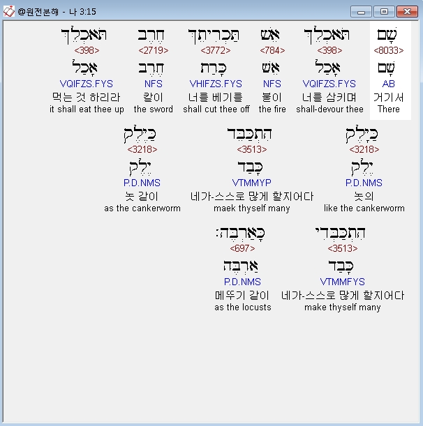 히브리어구약BHS,15 שָׁם תֹּאכְלֵךְ אֵשׁ תַּכְרִיתֵךְ חֶרֶב תֹּאכְלֵךְ כַּיָּלֶק הִתְכַּבֵּד כַּיֶּלֶק הִתְכַּבְּדִי כָּאַרְבֶּה׃