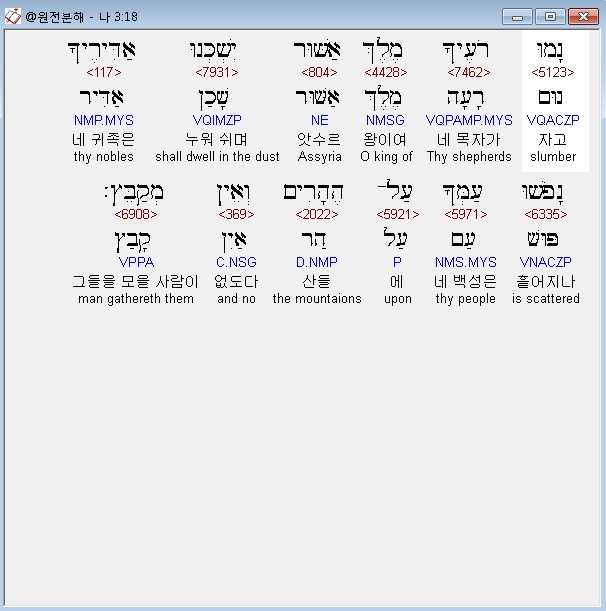 히브리어구약BHS,18 נָמוּ רֹעֶיךָ מֶלֶךְ אַשּׁוּר יִשְׁכְּנוּ אַדִּירֶיךָ נָפֹשׁוּ עַמְּךָ עַל־הֶהָרִים וְאֵין מְקַבֵּץ׃