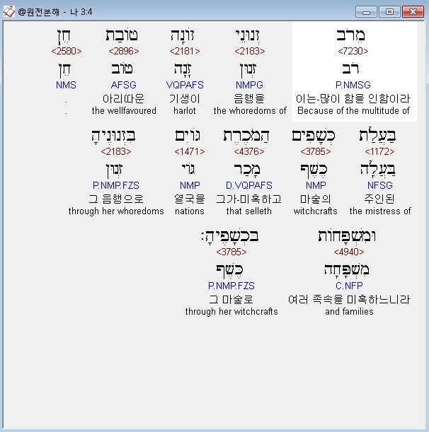 히브리어구약BHS,4 מֵרֹב זְנוּנֵי זֹונָה טֹובַת חֵן בַּעֲלַת כְּשָׁפִים הַמֹּכֶרֶת גֹּויִם בִּזְנוּנֶיהָ וּמִשְׁפָּחֹות בִּכְשָׁפֶיהָ׃