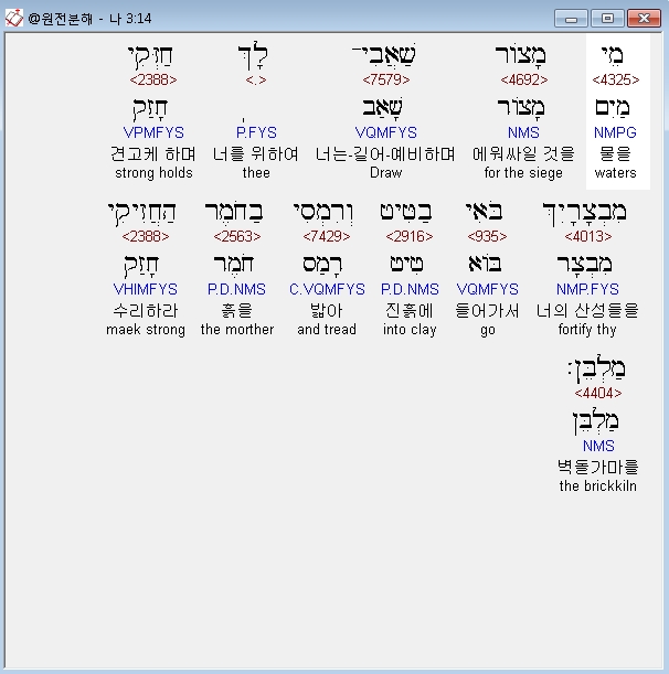 헬라어구약Septuagint,14 υδωρ περιοχης επισπασαι σεαυτη και κατακρατησον των οχυρωματων σου εμβηθι εις πηλον και συμπατηθητι εν αχυροις κατακρατησον υπερ πλινθον