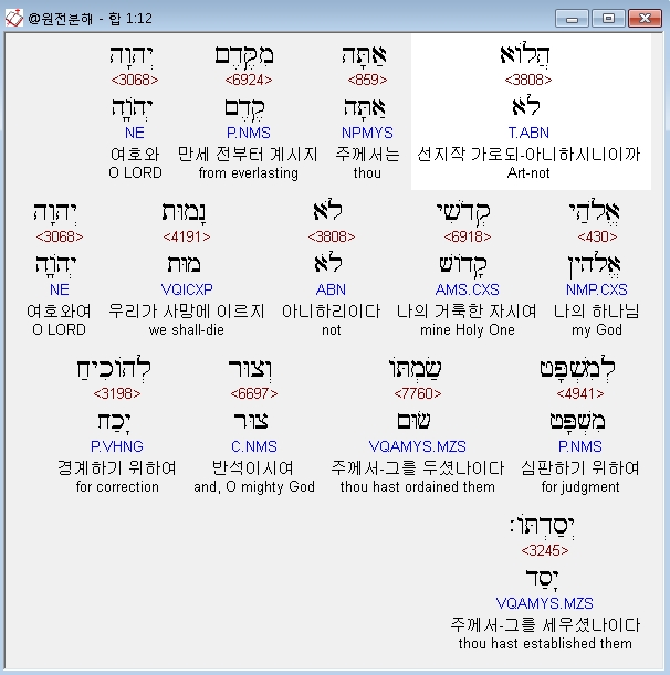 히브리어구약BHS,12 הֲלֹוא אַתָּה מִקֶּדֶם יְהוָה אֱלֹהַי קְדֹשִׁי לֹא נָמוּת יְהוָה לְמִשְׁפָּט שַׂמְתֹּו וְצוּר לְהֹוכִיחַ יְסַדְתֹּו׃