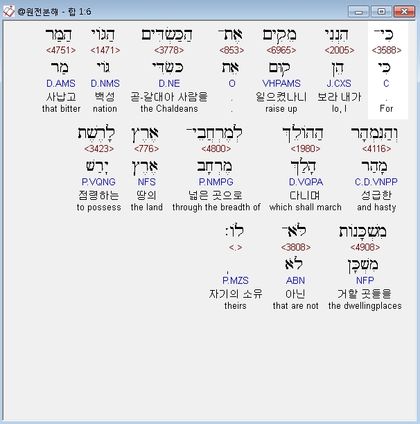 히브리어구약BHS,6 כִּי־הִנְנִי מֵקִים אֶת־הַכַּשְׂדִּים הַגֹּוי הַמַּר וְהַנִּמְהָר הַהֹולֵךְ לְמֶרְחֲבֵי־אֶרֶץ לָרֶשֶׁת מִשְׁכָּנֹות לֹּא־לֹו׃