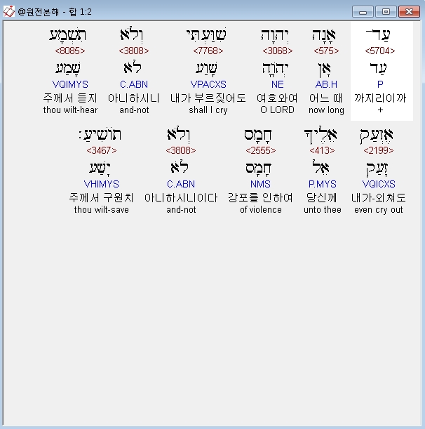 히브리어구약BHS,2 עַד־אָנָה יְהוָה שִׁוַּעְתִּי וְלֹא תִשְׁמָע אֶזְעַק אֵלֶיךָ חָמָס וְלֹא תֹושִׁיעַ׃