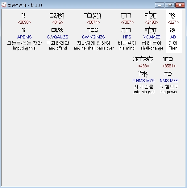 히브리어구약BHS,11 אָז חָלַף רוּחַ וַיַּעֲבֹר וְאָשֵׁם זוּ כֹחֹו לֵאלֹהֹו׃