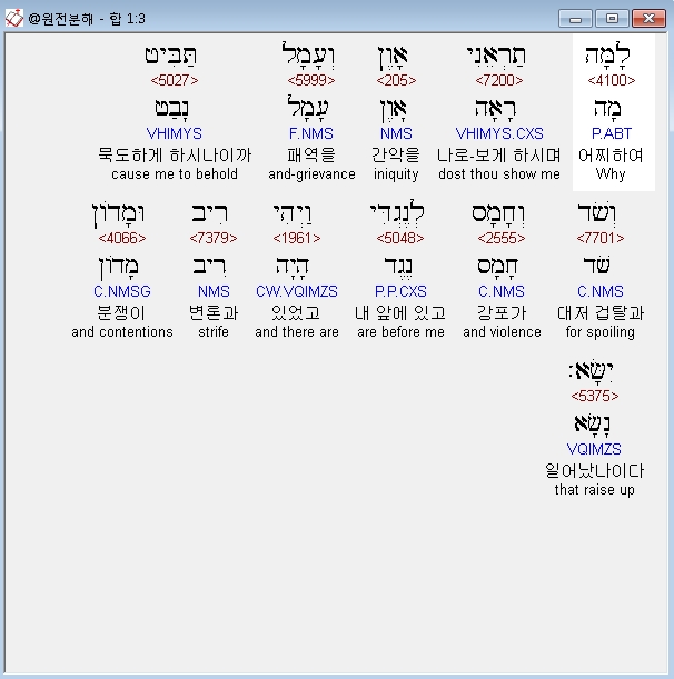 히브리어구약BHS,3 לָמָּה תַרְאֵנִי אָוֶן וְעָמָל תַּבִּיט וְשֹׁד וְחָמָס לְנֶגְדִּי וַיְהִי רִיב וּמָדֹון יִשָּׂא׃