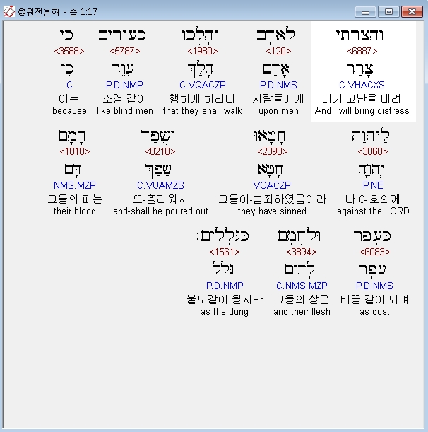 히브리어구약BHS,17 וַהֲצֵרֹתִי לָאָדָם וְהָלְכוּ כַּעִוְרִים כִּי לַיהוָה חָטָאוּ וְשֻׁפַּךְ דָּםָם כֶּעָפָר וּלְחֻםָם כַּגְּלָלִים׃