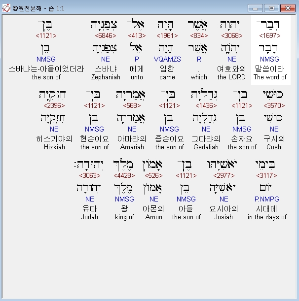 히브리어구약BHS,1 דְּבַר־יְהוָה אֲשֶׁר הָיָה אֶל־צְפַנְיָה בֶּן־כּוּשִׁי בֶן־גְּדַלְיָה בֶּן־אֲמַרְיָה בֶּן־חִזְקִיָּה בִּימֵי יֹאשִׁיָּהוּ בֶן־אָמֹון מֶלֶךְ יְהוּדָה׃