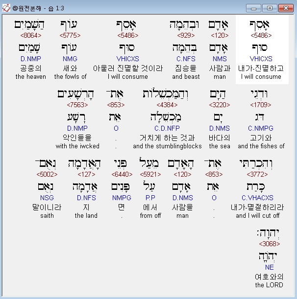 히브리어구약BHS,3 אָסֵף אָדָם וּבְהֵמָה אָסֵף עֹוף־הַשָּׁמַיִם וּדְגֵי הַיָּם וְהַמַּכְשֵׁלֹות אֶת־הָרְשָׁעִים וְהִכְרַתִּי אֶת־הָאָדָם מֵעַל פְּנֵי הָאֲדָמָה נְאֻם־יְהוָה׃
