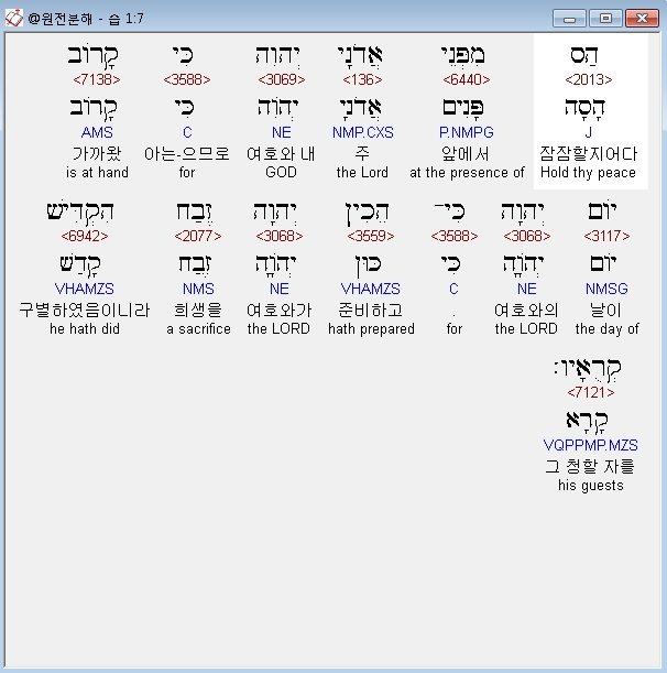 히브리어구약BHS,7 הַס מִפְּנֵי אֲדֹנָי יְהוִה כִּי קָרֹוב יֹום יְהוָה כִּי־הֵכִין יְהוָה זֶבַח הִקְדִּישׁ קְרֻאָיו׃