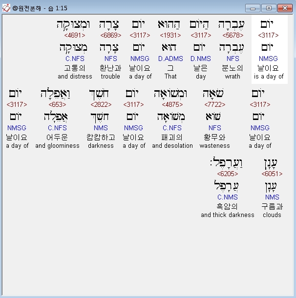 히브리어구약BHS,15 יֹום עֶבְרָה הַיֹּום הַהוּא יֹום צָרָה וּמְצוּקָה יֹום שֹׁאָה וּמְשֹׁואָה יֹום חֹשֶׁךְ וַאֲפֵלָה יֹום עָןָן וַעֲרָפֶל׃