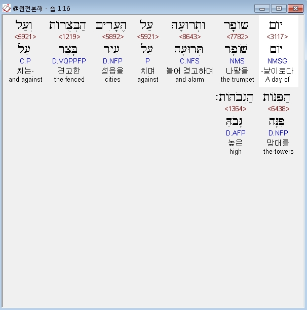 히브리어구약BHS,16 יֹום שֹׁופָר וּתְרוּעָה עַל הֶעָרִים הַבְּצֻרֹות וְעַל הַפִּנֹּות הַגְּבֹהֹות׃