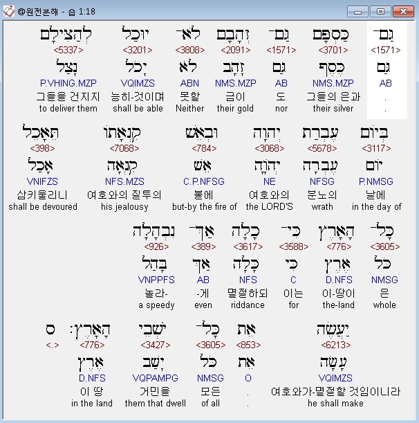 히브리어구약BHS,18 גַּם־כַּסְפָּם גַּם־זְהָבָם לֹא־יוּכַל לְהַצִּילָם בְּיֹום עֶבְרַת יְהוָה וּבְאֵשׁ קִנְאָתֹו תֵּאָכֵל כָּל־הָאָרֶץ כִּי־כָלָה אַךְ־נִבְהָלָה יַעֲשֶׂה אֵת כָּל־יֹשְׁבֵי הָאָרֶץ׃ ס