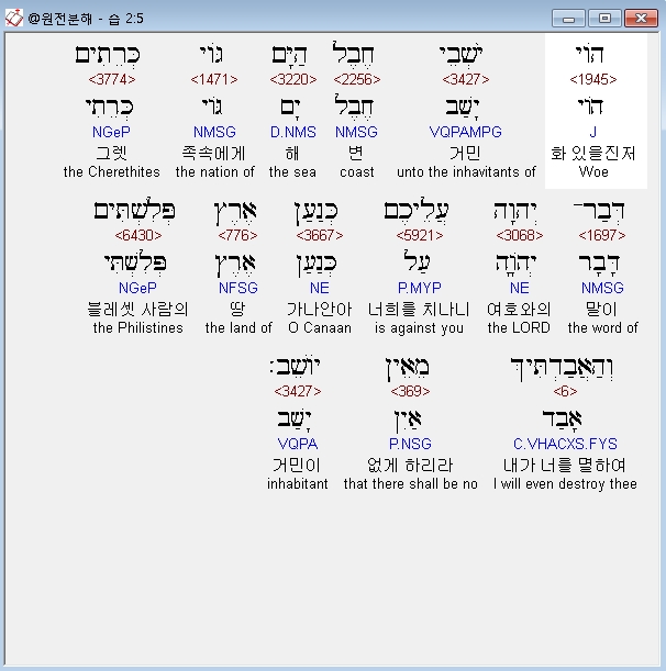 히브리어구약BHS,5 הֹוי יֹשְׁבֵי חֶבֶל הַיָּם גֹּוי כְּרֵתִים דְּבַר־יְהוָה עֲלֵיכֶם כְּנַעַן אֶרֶץ פְּלִשְׁתִּים וְהַאֲבַדְתִּיךְ מֵאֵין יֹושֵׁב׃