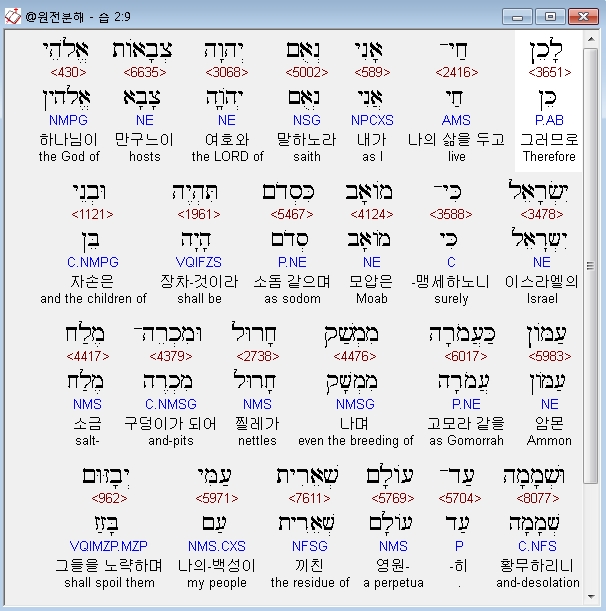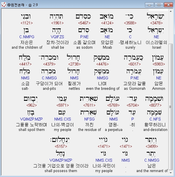 히브리어구약BHS,9 לָכֵן חַי־אָנִי נְאֻם יְהוָה צְבָאֹות אֱלֹהֵי יִשְׂרָאֵל כִּי־מֹואָב כִּסְדֹם תִּהְיֶה וּבְנֵי עַמֹּון כַּעֲמֹרָה מִמְשַׁק חָרוּל וּמִכְרֵה־מֶלַח וּשְׁמָמָה עַד־עֹולָם שְׁאֵרִית עַמִּי יְבָזּוּם וְיֶתֶר [כ= גֹּוי] [ק= גֹּויִי] יִנְחָלוּם׃