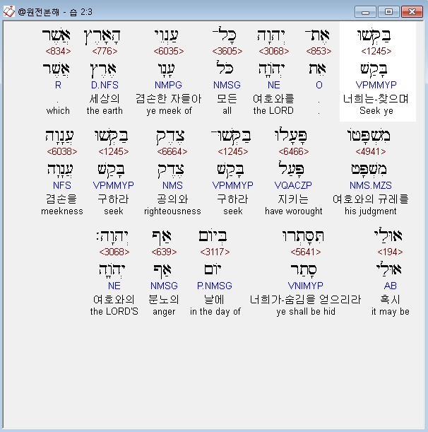 히브리어구약BHS,3 בַּקְּשׁוּ אֶת־יְהוָה כָּל־עַנְוֵי הָאָרֶץ אֲשֶׁר מִשְׁפָּטֹו פָּעָלוּ בַּקְּשׁוּ־צֶדֶק בַּקְּשׁוּ עֲנָוָה אוּלַי תִּסָּתְרוּ בְּיֹום אַף־יְהוָה׃