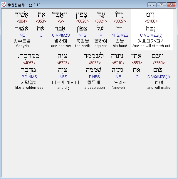 히브리어구약BHS,13 וְיֵט יָדֹו עַל־צָפֹון וִיאַבֵּד אֶת־אַשּׁוּר וְיָשֵׂם אֶת־נִינְוֵה לִשְׁמָמָה צִיָּה כַּמִּדְבָּר׃