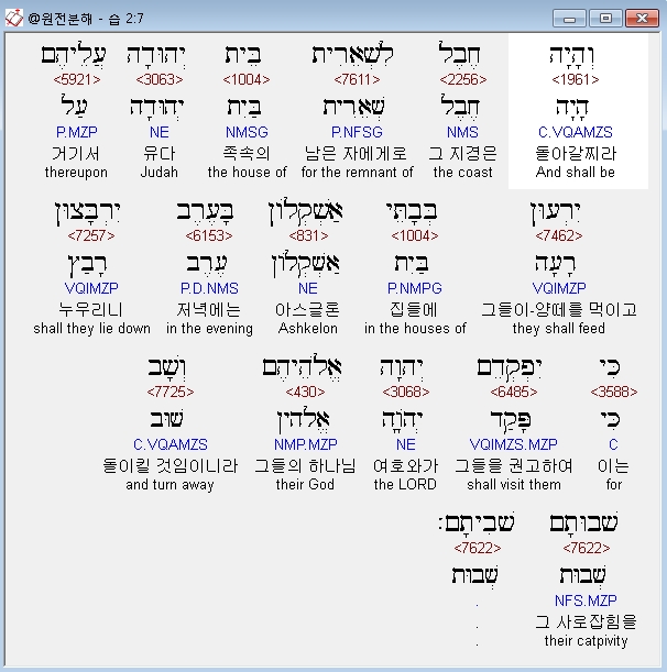 헬라어구약Septuagint,7 και εσται το σχοινισμα της θαλασσης τοις καταλοιποις οικου ιουδα επ' αυτους νεμησονται εν τοις οικοις ασκαλωνος δειλης καταλυσουσιν απο προσωπου υιων ιουδα οτι επεσκεπται αυτους κυριος ο θεος αυτων και απεστρεψε την αιχμαλωσιαν αυτων