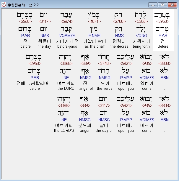 히브리어구약BHS,2 בְּטֶרֶם לֶדֶת חֹק כְּמֹץ עָבַר יֹום בְּטֶרֶם לֹא־יָבֹוא עֲלֵיכֶם חֲרֹון אַף־יְהוָה בְּטֶרֶם לֹא־יָבֹוא עֲלֵיכֶם יֹום אַף־יְהוָה׃