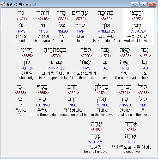 히브리어구약BHS,14 וְרָבְצוּ בְתֹוכָהּ עֲדָרִים כָּל־חַיְתֹו־גֹוי גַּם־קָאַת גַּם־קִפֹּד בְּכַפְתֹּרֶיהָ יָלִינוּ קֹול יְשֹׁורֵר בַּחַלֹּון חֹרֶב בַּסַּף כִּי אַרְזָה עֵרָה׃