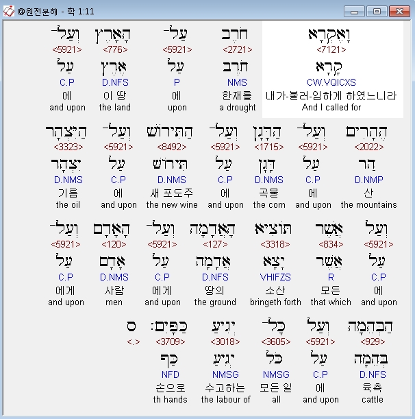 히브리어구약BHS,11 וָאֶקְרָא חֹרֶב עַל־הָאָרֶץ וְעַל־הֶהָרִים וְעַל־הַדָּגָן וְעַל־הַתִּירֹושׁ וְעַל־הַיִּצְהָר וְעַל אֲשֶׁר תֹּוצִיא הָאֲדָמָה וְעַל־הָאָדָם וְעַל־הַבְּהֵמָה וְעַל כָּל־יְגִיעַ כַּפָּיִם׃ ס