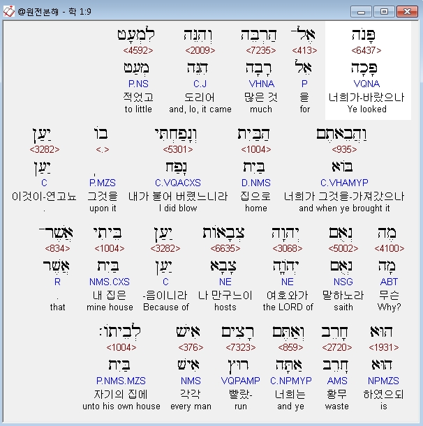 히브리어구약BHS,9 פָּנֹה אֶל־הַרְבֵּה וְהִנֵּה לִמְעָט וַהֲבֵאתֶם הַבַּיִת וְנָפַחְתִּי בֹו יַעַן מֶה נְאֻם יְהוָה צְבָאֹות יַעַן בֵּיתִי אֲשֶׁר־הוּא חָרֵב וְאַתֶּם רָצִים אִישׁ לְבֵיתֹו׃
