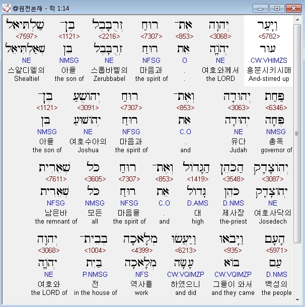 영어NRSV,14 And the LORD stirred up the spirit of Zerubbabel son of Shealtiel, governor of Judah, and the spirit of Joshua son of Jehozadak, the high priest, and the spirit of all the remnant of the people; and they came and worked on the house of the LORD of hosts, their God,