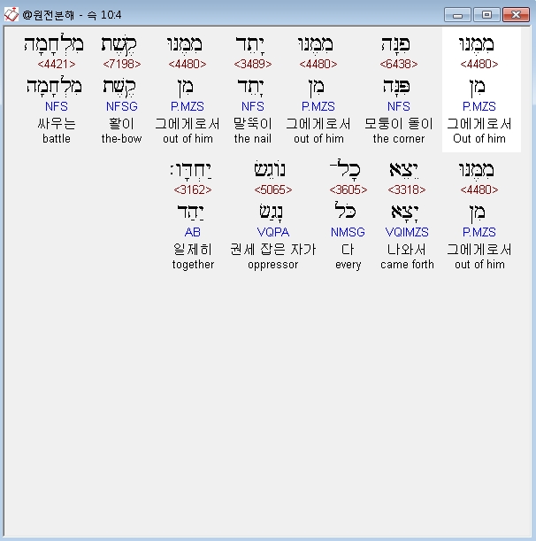히브리어구약BHS,4 מִמֶּנּוּ פִנָּה מִמֶּנּוּ יָתֵד מִמֶּנּוּ קֶשֶׁת מִלְחָמָה מִמֶּנּוּ יֵצֵא כָל־נֹוגֵשׂ יַחְדָּו׃