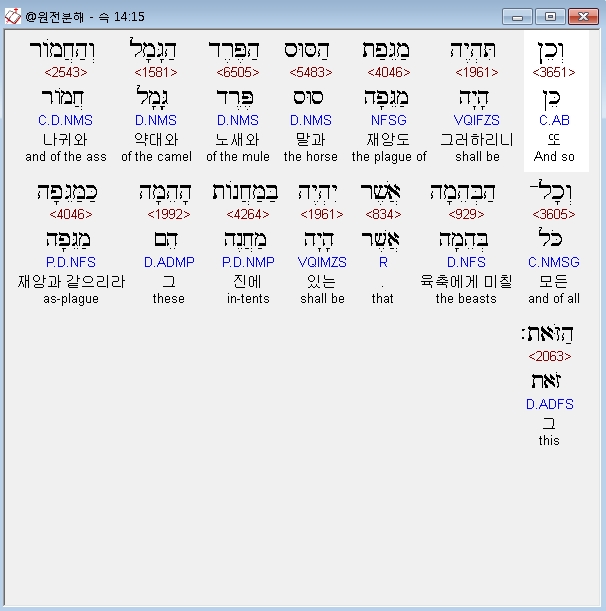히브리어구약BHS,15 וְכֵן תִּהְיֶה מַגֵּפַת הַסּוּס הַפֶּרֶד הַגָּמָל וְהַחֲמֹור וְכָל־הַבְּהֵמָה אֲשֶׁר יִהְיֶה בַּמַּחֲנֹות הָהֵמָּה כַּמַּגֵּפָה הַזֹּאת׃
