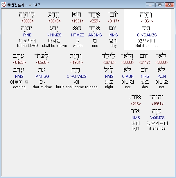 히브리어구약BHS,7 וְהָיָה יֹום־אֶחָד הוּא יִוָּדַע לַיהוָה לֹא־יֹום וְלֹא־לָיְלָה וְהָיָה לְעֵת־עֶרֶב יִהְיֶה־אֹור׃