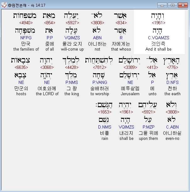 히브리어구약BHS,17 וְהָיָה אֲשֶׁר לֹא־יַעֲלֶה מֵאֵת מִשְׁפְּחֹות הָאָרֶץ אֶל־יְרוּשָׁלִַם לְהִשְׁתַּחֲוֹת לְמֶלֶךְ יְהוָה צְבָאֹות וְלֹא עֲלֵיהֶם יִהְיֶה הַגָּשֶׁם׃