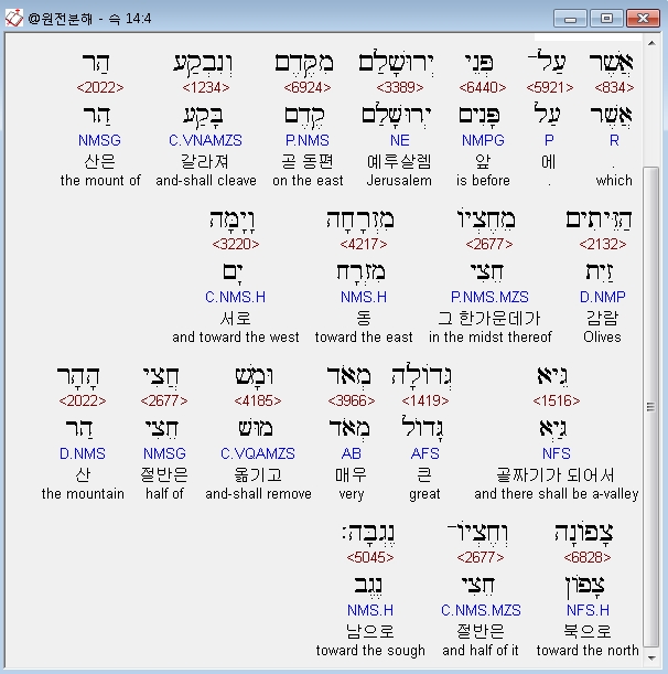 히브리어구약BHS,4 וְעָמְדוּ רַגְלָיו בַּיֹּום־הַהוּא עַל־הַר הַזֵּתִים אֲשֶׁר עַל־פְּנֵי יְרוּשָׁלִַם מִקֶּדֶם וְנִבְקַע הַר הַזֵּיתִים מֵחֶצְיֹו מִזְרָחָה וָיָמָּה גֵּיא גְּדֹולָה מְאֹד וּמָשׁ חֲצִי הָהָר צָפֹונָה וְחֶצְיֹו־נֶגְבָּה׃