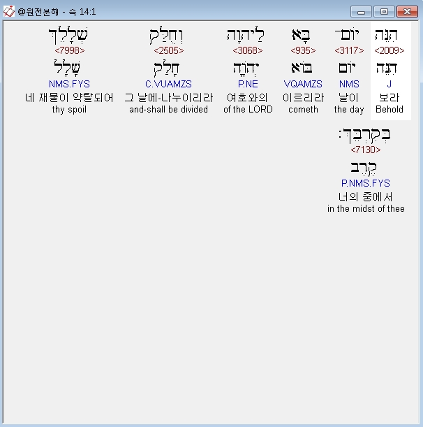 히브리어구약BHS,1 הִנֵּה יֹום־בָּא לַיהוָה וְחֻלַּק שְׁלָלֵךְ בְּקִרְבֵּךְ׃