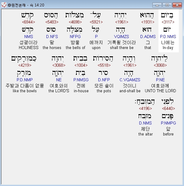 히브리어구약BHS,20 בַּיֹּום הַהוּא יִהְיֶה עַל־מְצִלֹּות הַסּוּס קֹדֶשׁ לַיהוָה וְהָיָה הַסִּירֹות בְּבֵית יְהוָה כַּמִּזְרָקִים לִפְנֵי הַמִּזְבֵּחַ׃