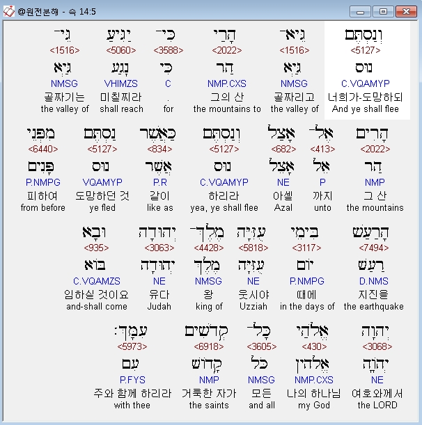 히브리어구약BHS,5 וְנַסְתֶּם גֵּיא־הָרַי כִּי־יַגִּיעַ גֵּי־הָרִים אֶל־אָצַל וְנַסְתֶּם כַּאֲשֶׁר נַסְתֶּם מִפְּנֵי הָרַעַשׁ בִּימֵי עֻזִּיָּה מֶלֶךְ־יְהוּדָה וּבָא יְהוָה אֱלֹהַי כָּל־קְדֹשִׁים עִמָּךְ׃