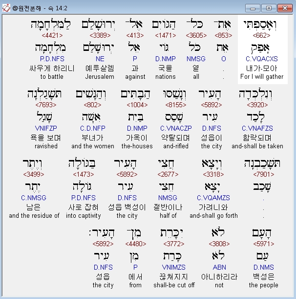 헬라어구약Septuagint,2 και επισυναξω παντα τα εθνη επι ιερουσαλημ εις πολεμον και αλωσεται η πολις και διαρπαγησονται αι οικιαι και αι γυναικες μολυνθησονται και εξελευσεται το ημισυ της πολεως εν αιχμαλωσια οι δε καταλοιποι του λαου μου ου μη εξολεθρευθωσιν εκ της πολεως
